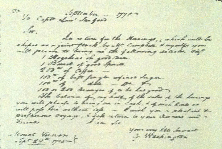 Check out the image of his note below. It says, "Mount Vernon Sept. 29th 1770 Sir, In return for the Herrings, (which will be shipped as a joint stock by Mr Campbell & myself) you will please to bring me the following Articles,